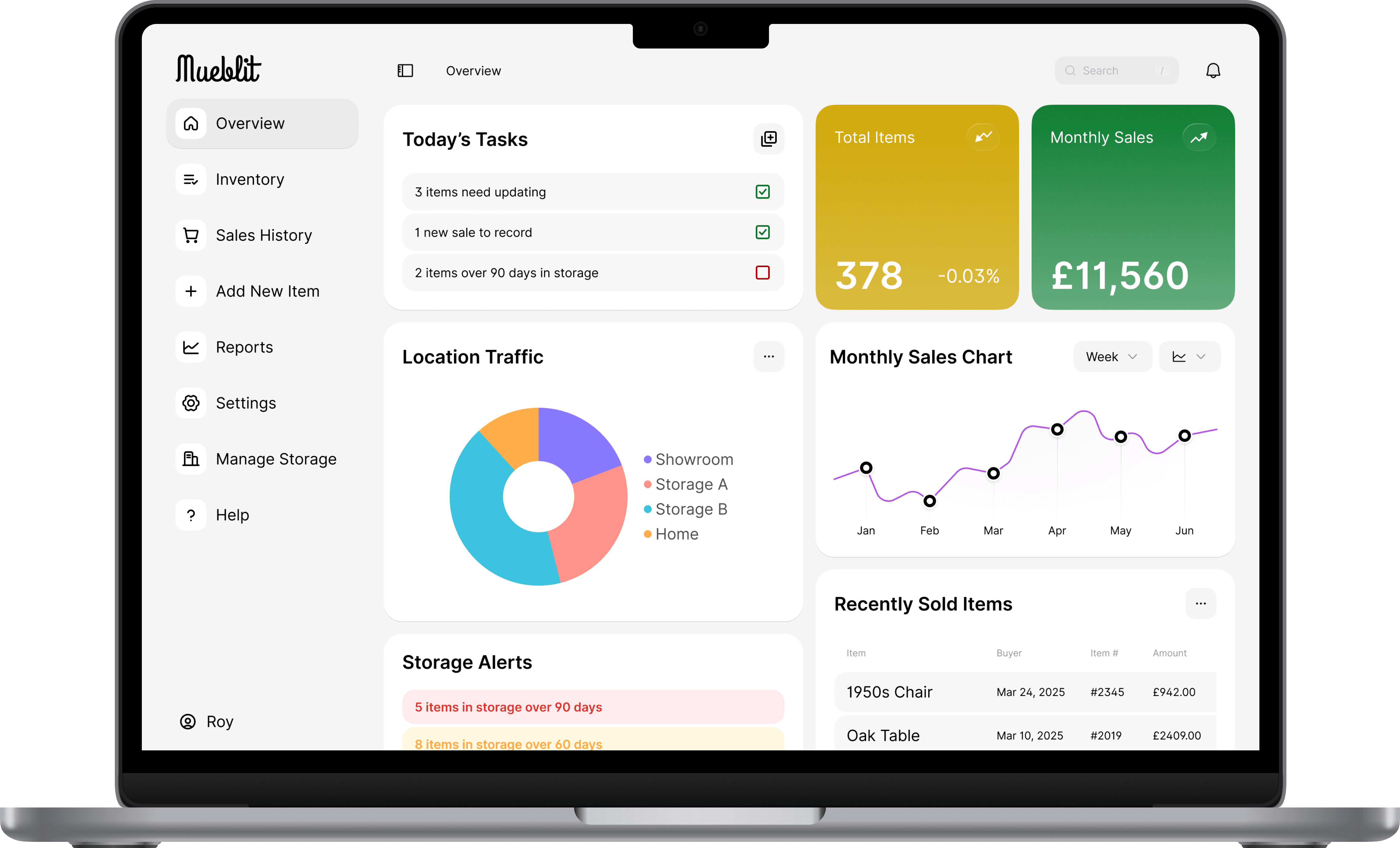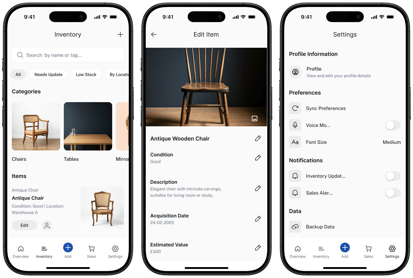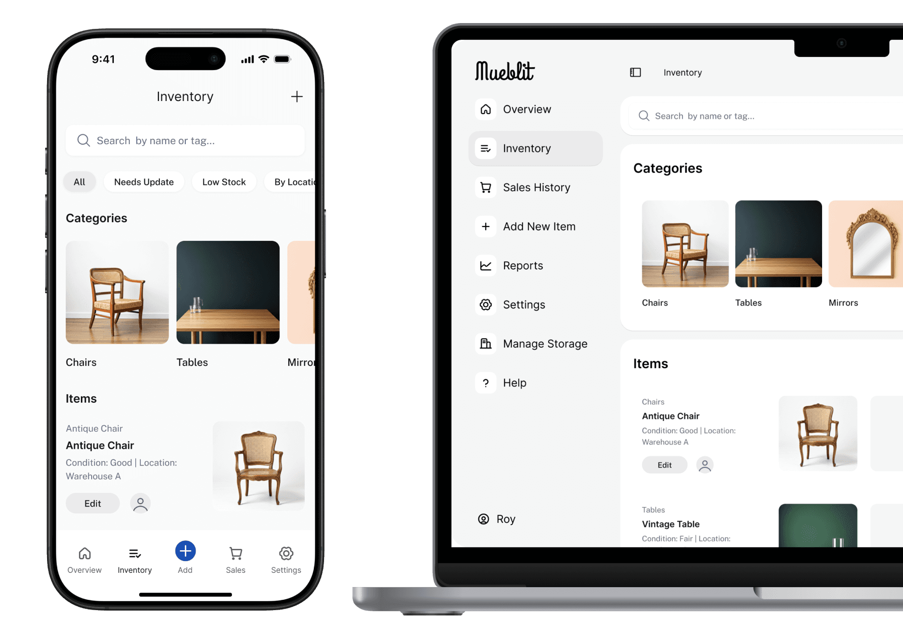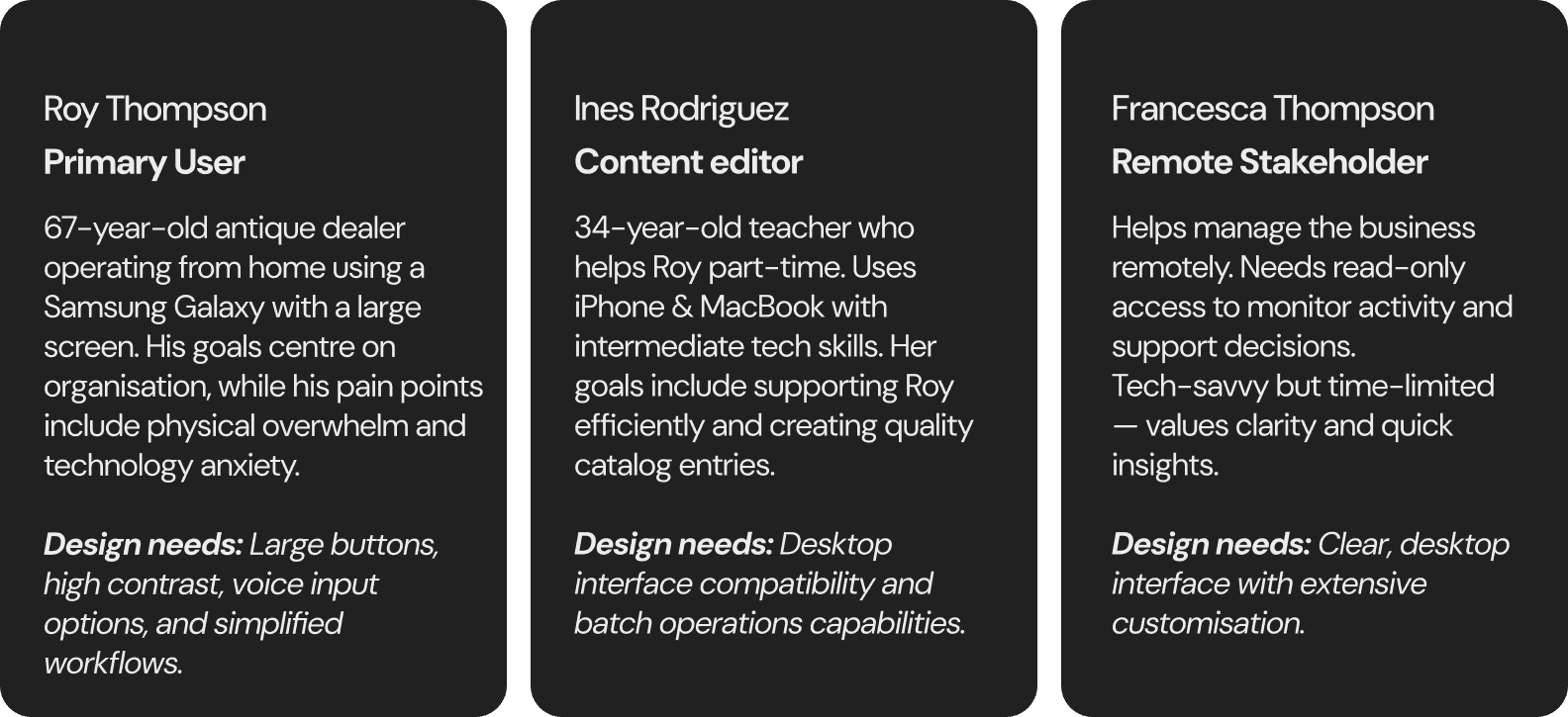 Roy, an experienced antique dealer, was overwhelmed by the volume of unsorted inventory and lacked a digital system. Existing tools were too complex or inaccessible, leaving him and his small team without a practical way to track and manage items.