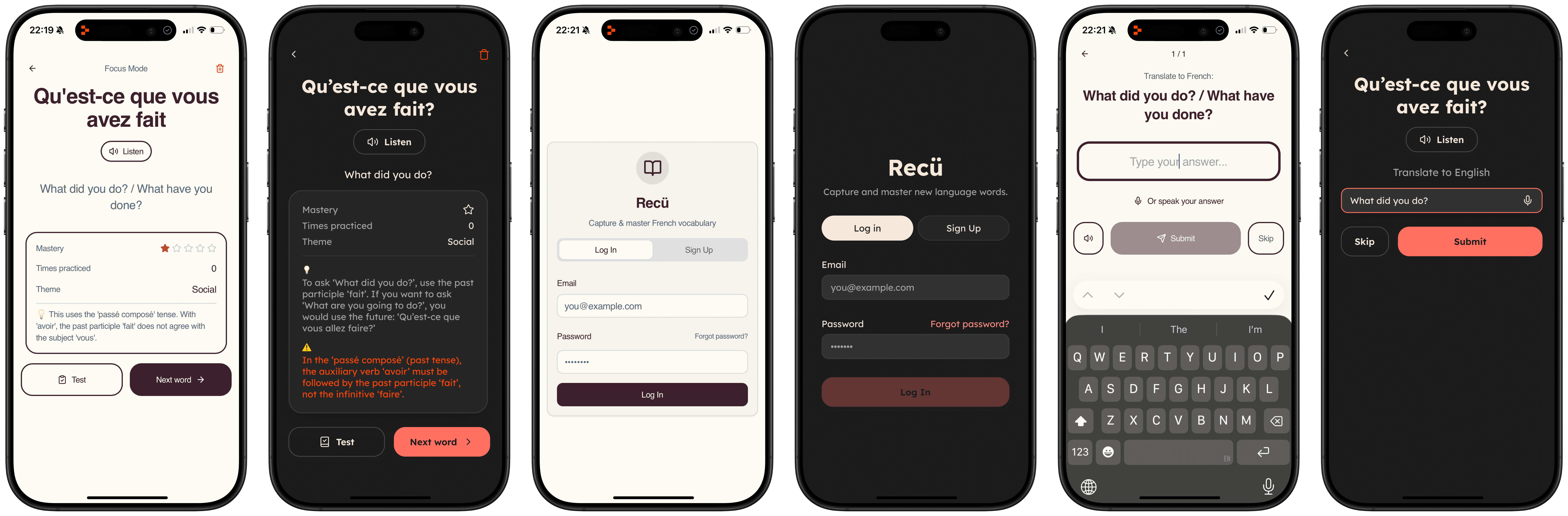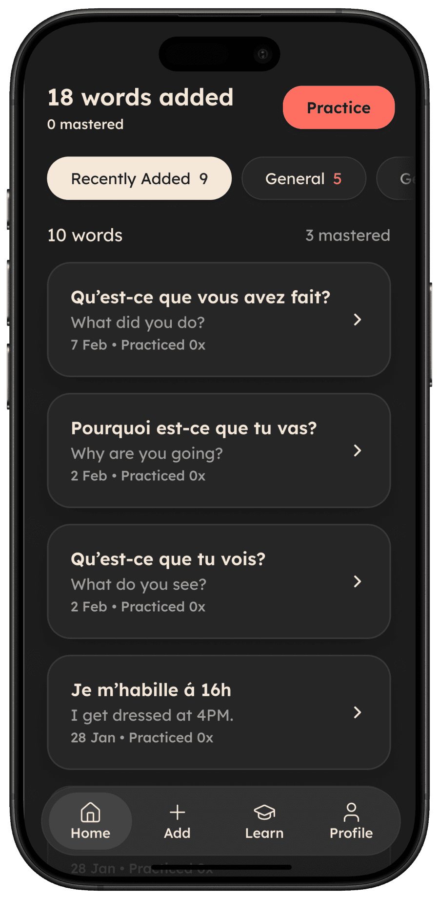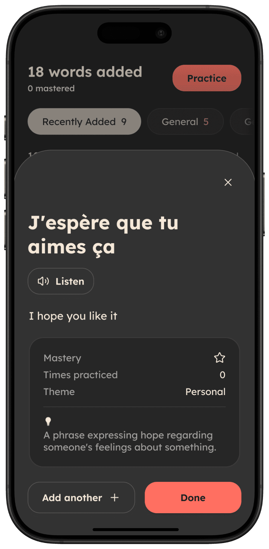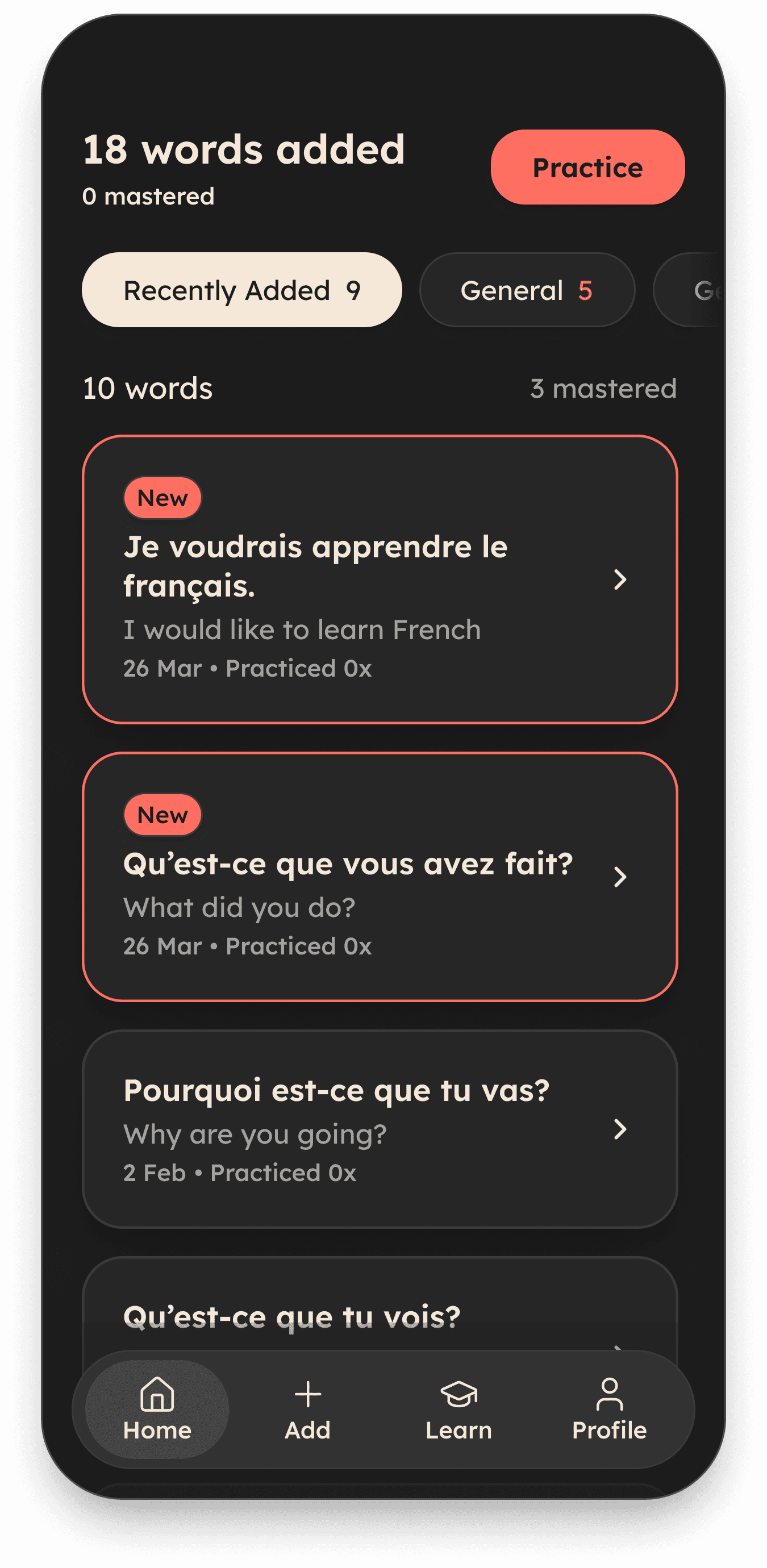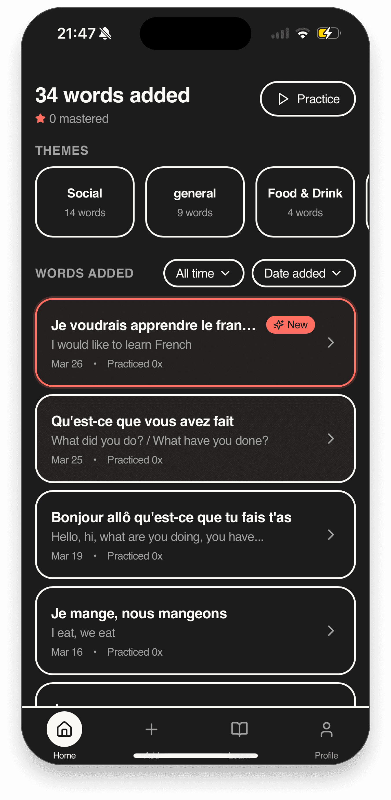 Users reviewed their captured phrases in the evening. Consequently, I developed the UI with a dark-mode-first approach to reduce eye strain during those sessions.