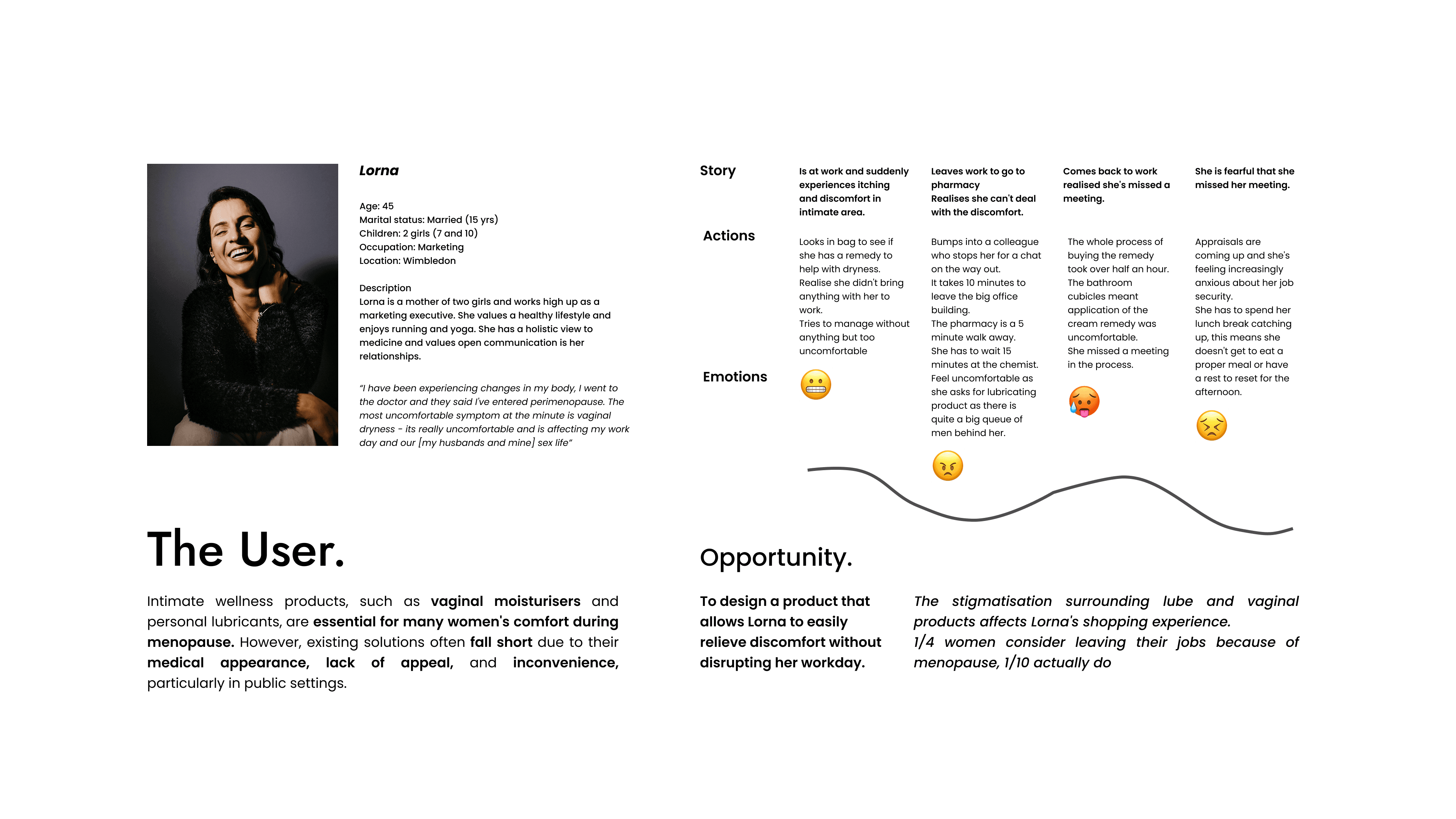 Initially, UOA focused on designing for women going through menopause, a hormonal change that occurs around the ages of 45-55. Among many other uncomfortable symptoms, such as hot flushes, weight changes, and brain fog, thinning, drying, and inflammation of the vaginal walls, known as vaginal atrophy, affects 34% of women during menopause.